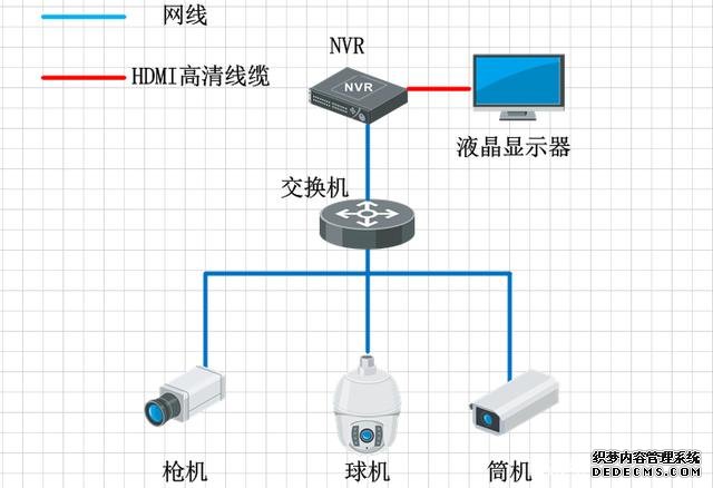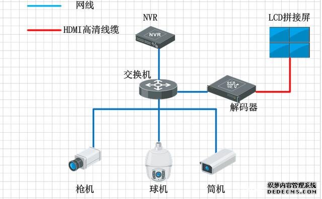 小型的監(jiān)控系統(tǒng)組成非常簡(jiǎn)單,通常就是前端幾個(gè)攝像頭,然后接交換機(jī),交換機(jī)接NVR,NVR直接連接顯示器,直接在顯示器上預(yù)覽畫面,NVR的解碼能力比DVR的解碼能力更強(qiáng),現(xiàn)在普通的NVR都是支持1-8路的1080P的攝像頭解碼,但最近幾年也出現(xiàn)幾款的高端NVR,集成更加強(qiáng)大的解碼功能,但絲毫未改變NVR就是存儲(chǔ)的產(chǎn)品,所以一般通過(guò)NVR顯示,都是應(yīng)用在一些低端,點(diǎn)位數(shù)較小的項(xiàng)目中,比如超市和店鋪這類預(yù)算較低的項(xiàng)目。同DVR顯示一樣,普通的NVR的監(jiān)控上墻也會(huì)遇到畫面切換控制不方便,且不支持視頻畫面開窗漫游等功能。
